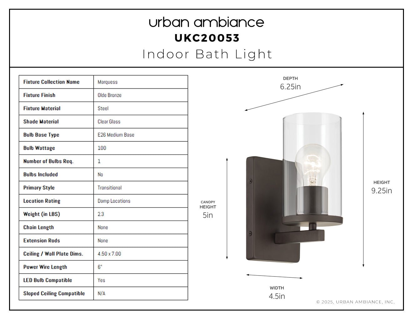 UKC20053 Transitional Indoor Bath Light, 9.25''H x 4.5''W x 6.25''Dep, Olde Bronze Finish, Marquess Collection