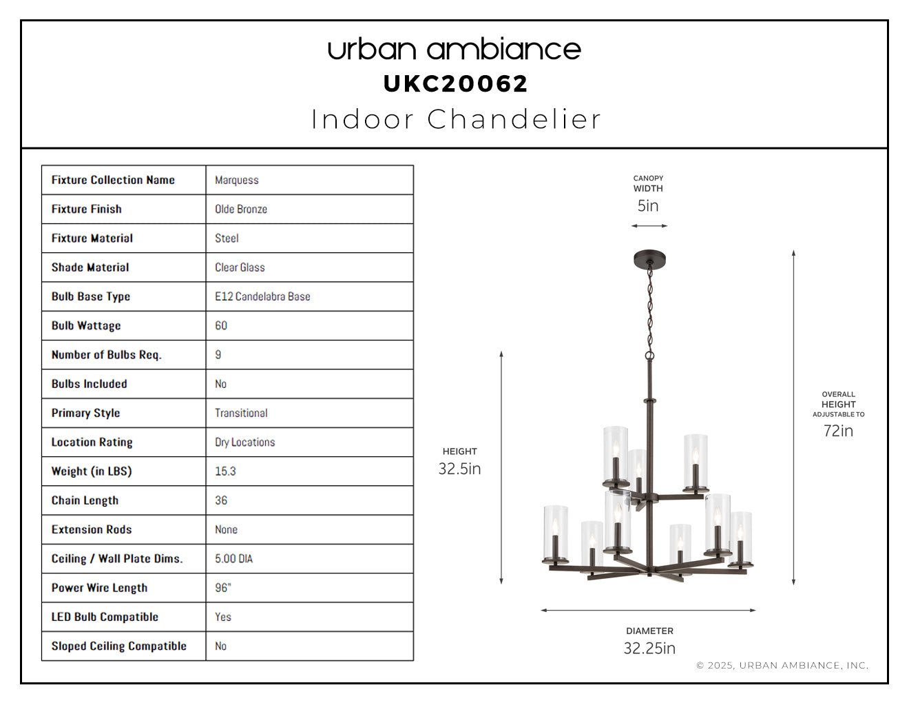 UKC20062 Transitional Indoor Chandelier, 32.5''H x 32.25''W x 32.25''Dep, Olde Bronze Finish, Marquess Collection