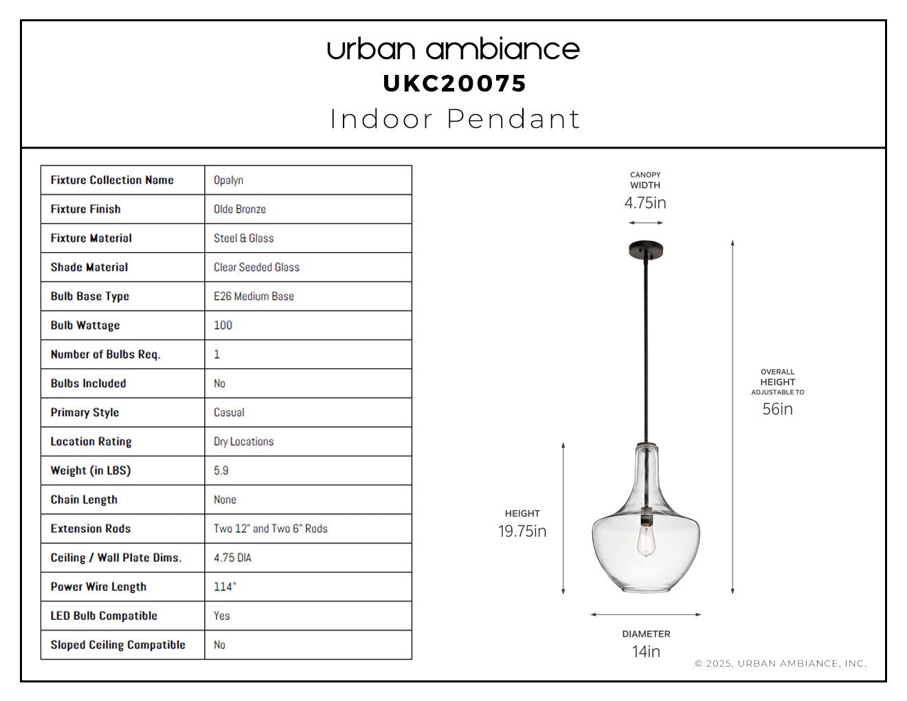 UKC20075 Casual Indoor Pendant, 19.75''H x 14''W x 14''Dep, Olde Bronze Finish, Opalyn Collection