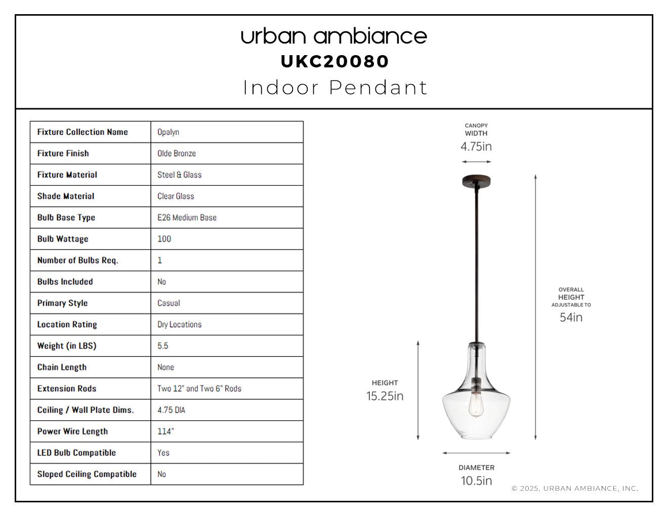 UKC20080 Casual Indoor Pendant, 15.25''H x 10.5''W x 10.5''Dep, Olde Bronze Finish, Opalyn Collection