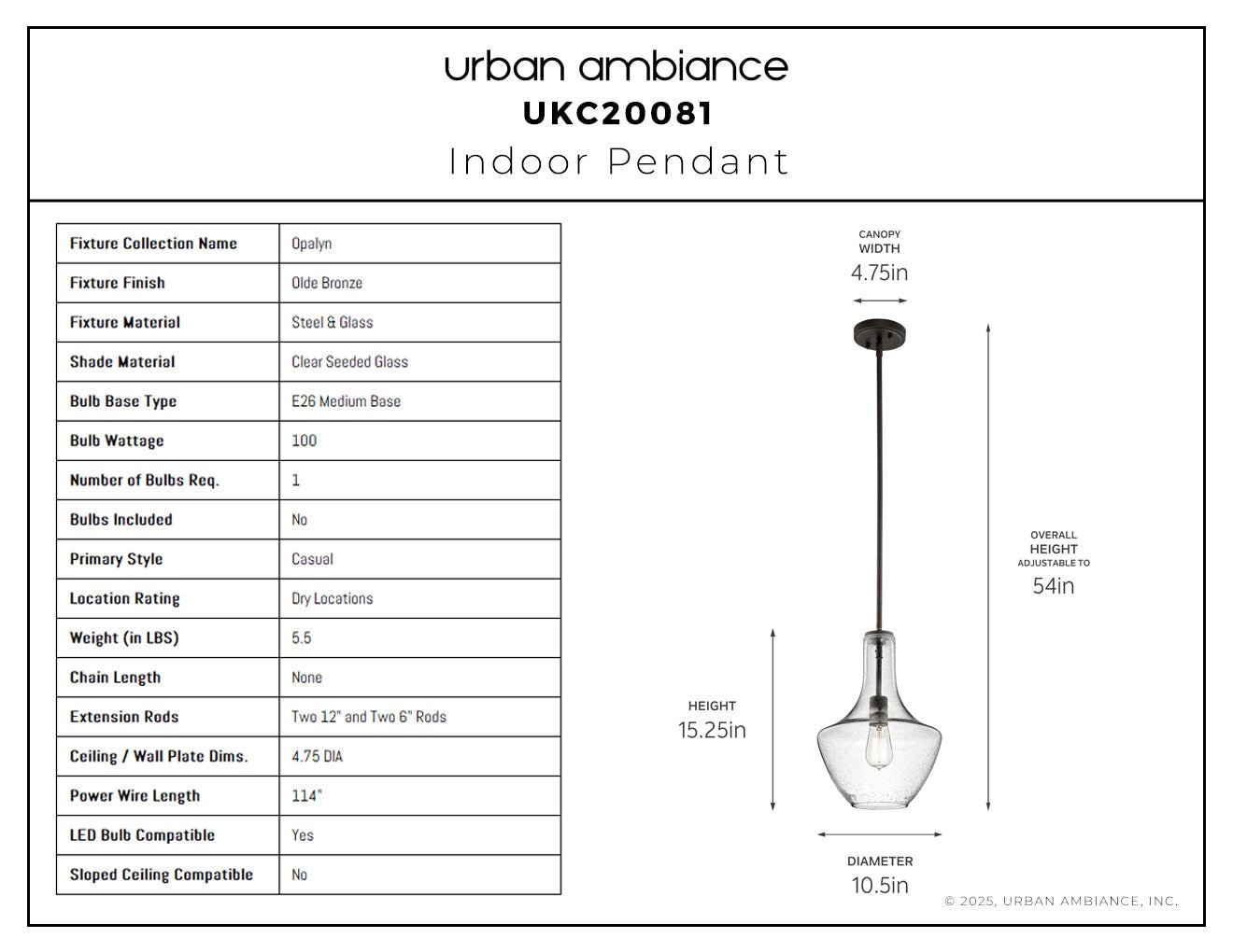 UKC20081 Casual Indoor Pendant, 15.25''H x 10.5''W x 10.5''Dep, Olde Bronze Finish, Opalyn Collection