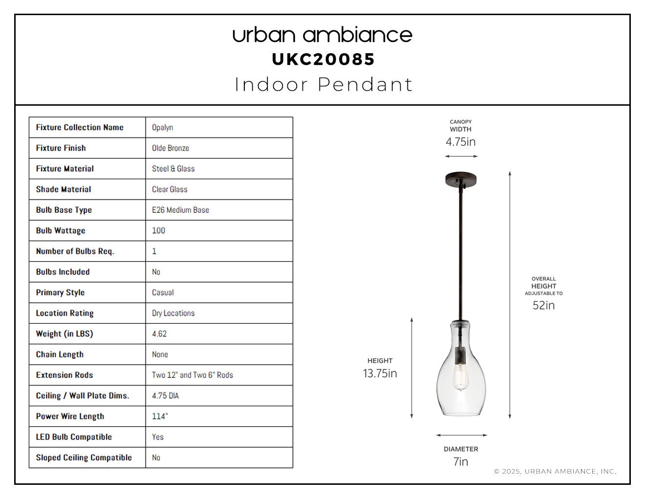 UKC20085 Casual Indoor Pendant, 13.75''H x 7''W x 7''Dep, Olde Bronze Finish, Opalyn Collection
