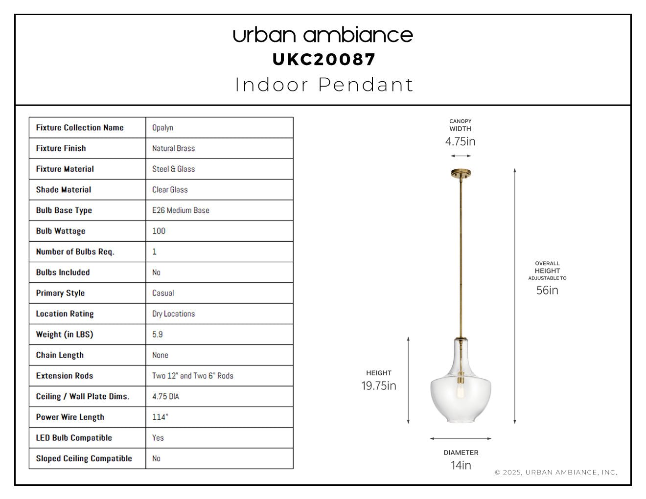 UKC20087 Casual Indoor Pendant, 19.75''H x 14''W x 14''Dep, Natural Brass Finish, Opalyn Collection
