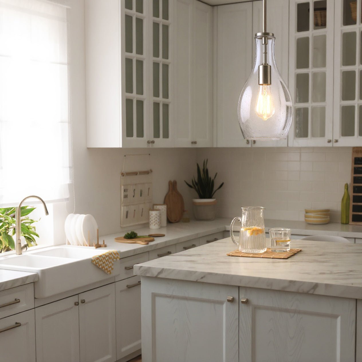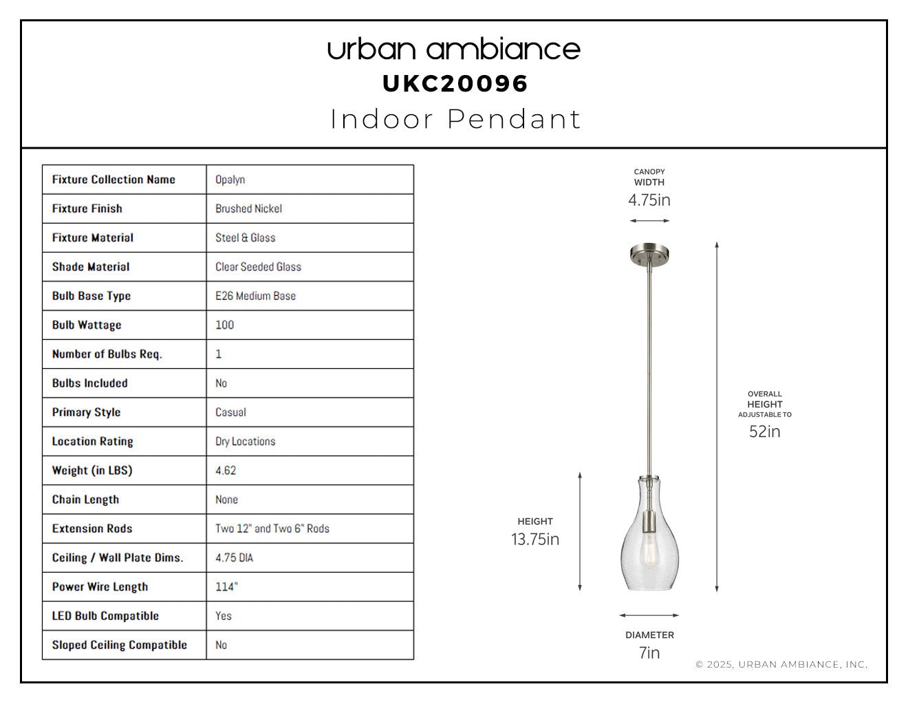UKC20096 Casual Indoor Pendant, 13.75''H x 7''W x 7''Dep, Brushed Nickel Finish, Opalyn Collection