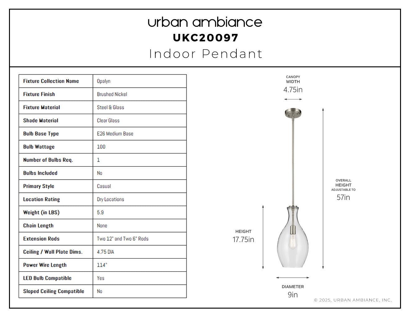 UKC20097 Casual Indoor Pendant, 17.75''H x 9''W x 9''Dep, Brushed Nickel Finish, Opalyn Collection