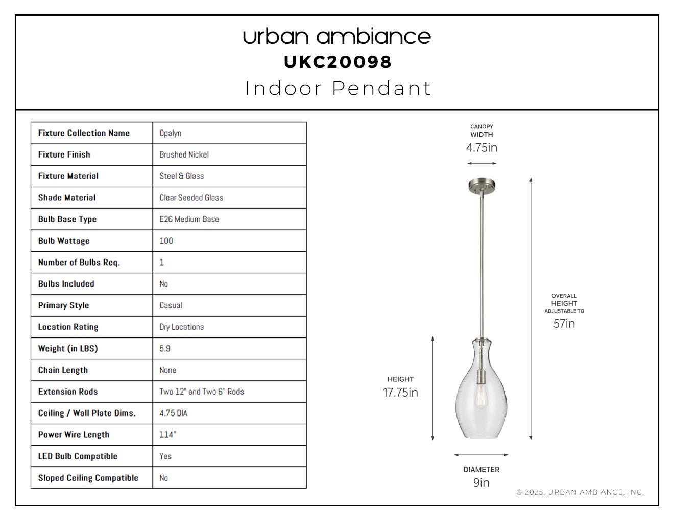 UKC20098 Casual Indoor Pendant, 17.75''H x 9''W x 9''Dep, Brushed Nickel Finish, Opalyn Collection