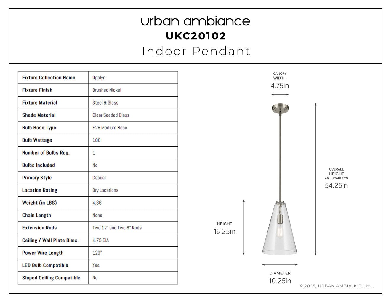 UKC20102 Casual Indoor Pendant, 15.25''H x 10.25''W x 10.25''Dep, Brushed Nickel Finish, Opalyn Collection
