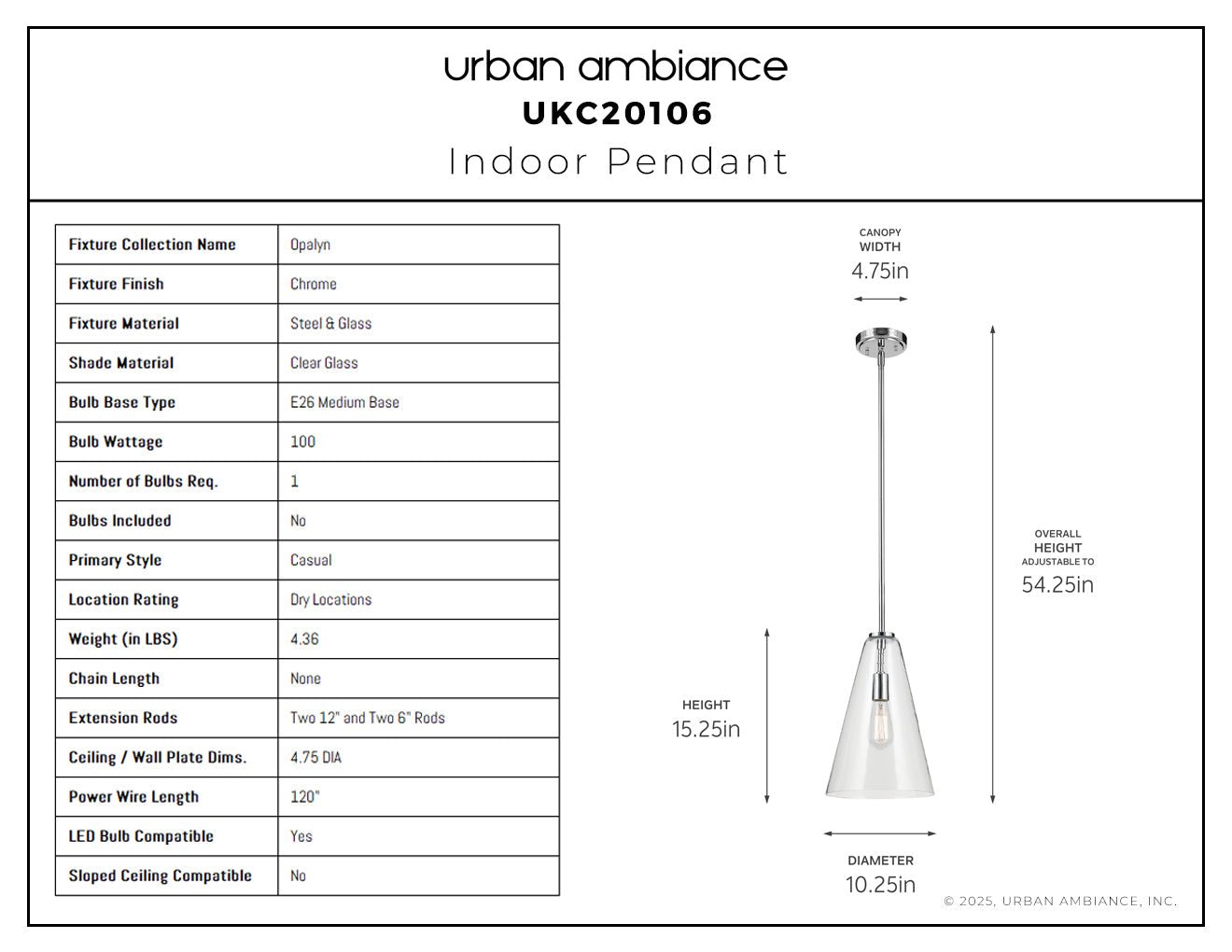 UKC20106 Casual Indoor Pendant, 15.25''H x 10.25''W x 10.25''Dep, Chrome Finish, Opalyn Collection