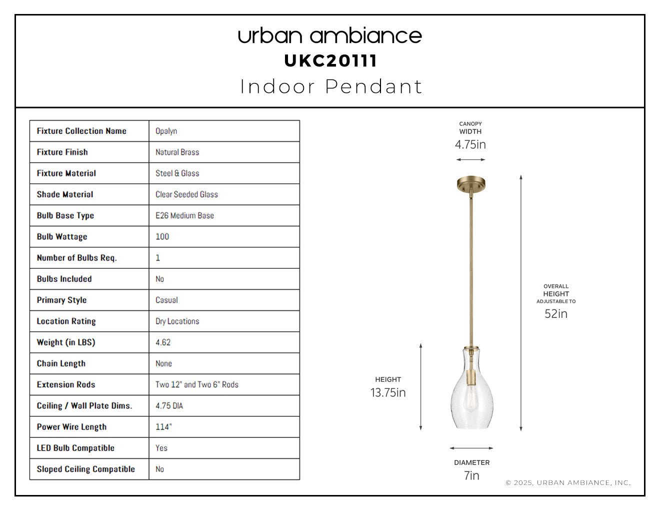 UKC20111 Casual Indoor Pendant, 13.75''H x 7''W x 7''Dep, Natural Brass Finish, Opalyn Collection