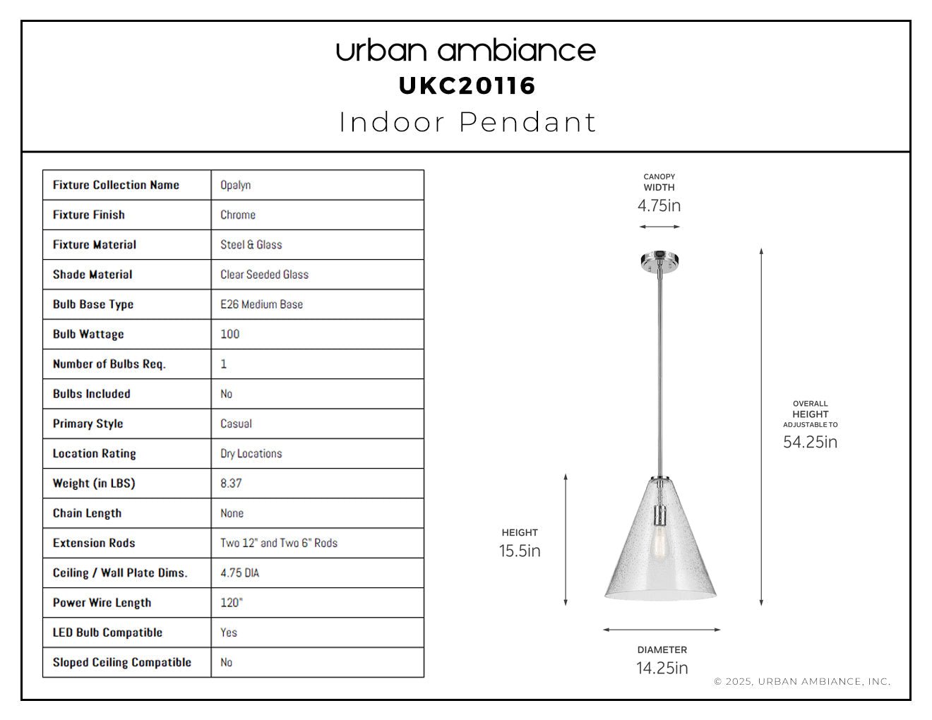 UKC20116 Casual Indoor Pendant, 15.5''H x 14.25''W x 14.25''Dep, Chrome Finish, Opalyn Collection