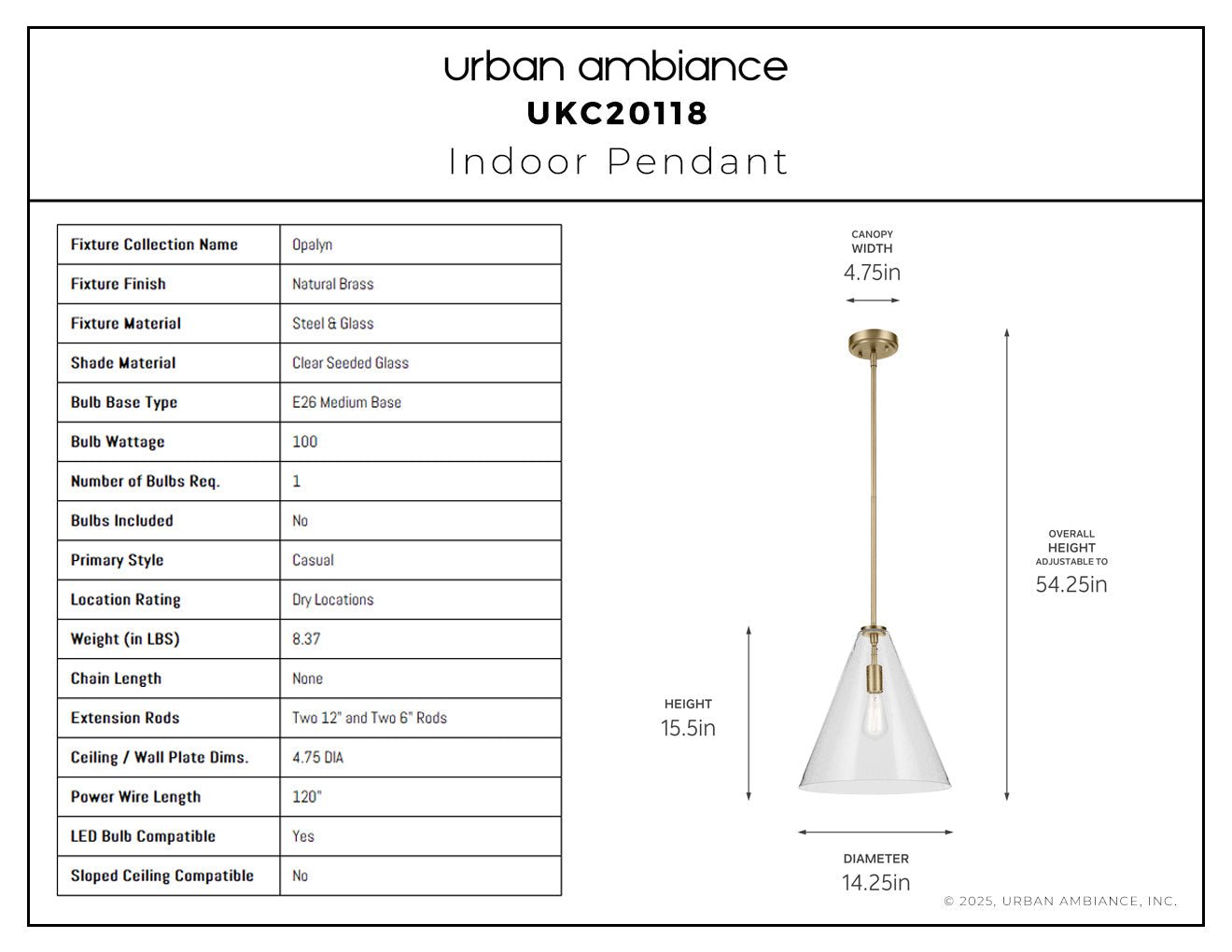 UKC20118 Casual Indoor Pendant, 15.5''H x 14.25''W x 14.25''Dep, Natural Brass Finish, Opalyn Collection