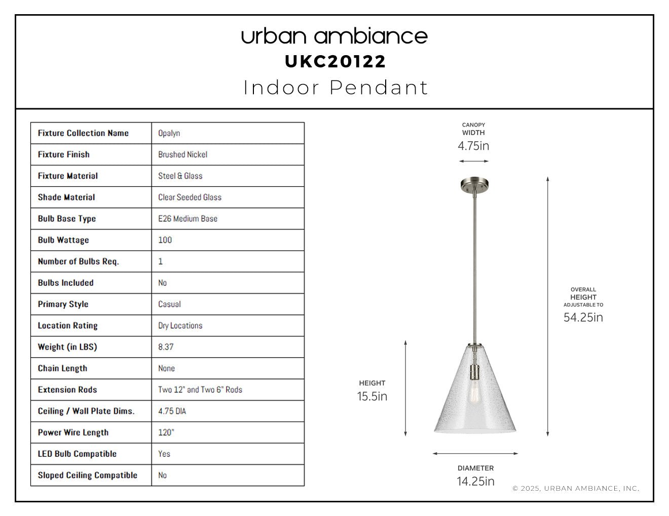 UKC20122 Casual Indoor Pendant, 15.5''H x 14.25''W x 14.25''Dep, Brushed Nickel Finish, Opalyn Collection