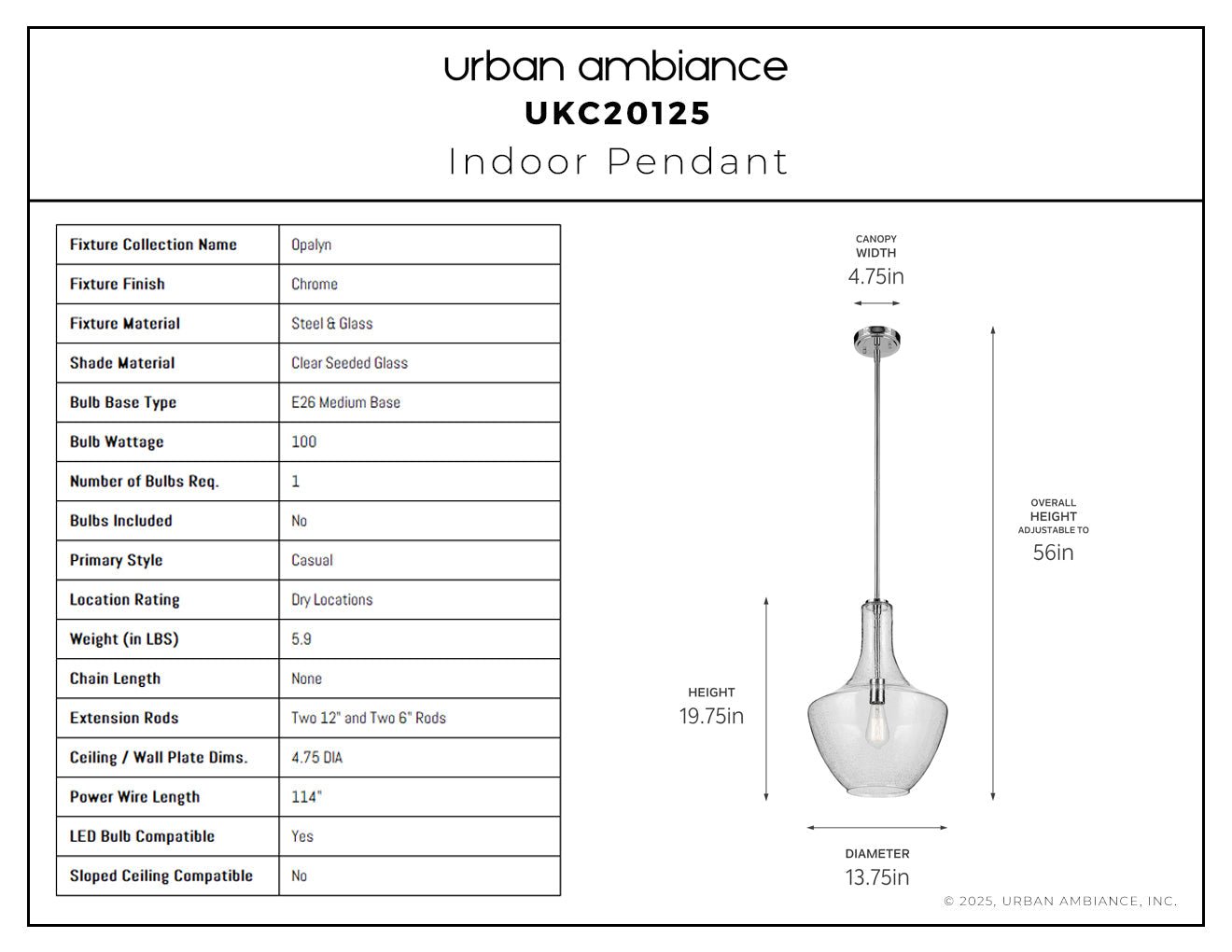 UKC20125 Casual Indoor Pendant, 19.75''H x 14''W x 14''Dep, Chrome Finish, Opalyn Collection