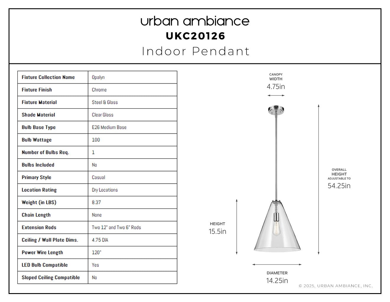 UKC20126 Casual Indoor Pendant, 15.5''H x 14.25''W x 14.25''Dep, Chrome Finish, Opalyn Collection