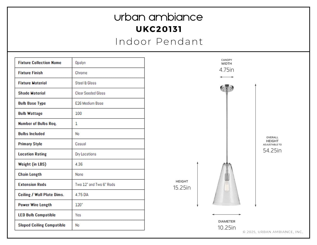 UKC20131 Casual Indoor Pendant, 15.25''H x 10.25''W x 10.25''Dep, Chrome Finish, Opalyn Collection