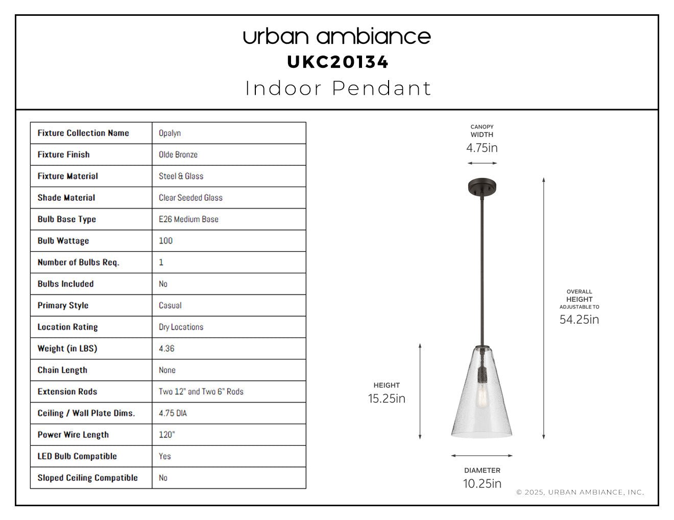 UKC20134 Casual Indoor Pendant, 15.25''H x 10.25''W x 10.25''Dep, Olde Bronze Finish, Opalyn Collection