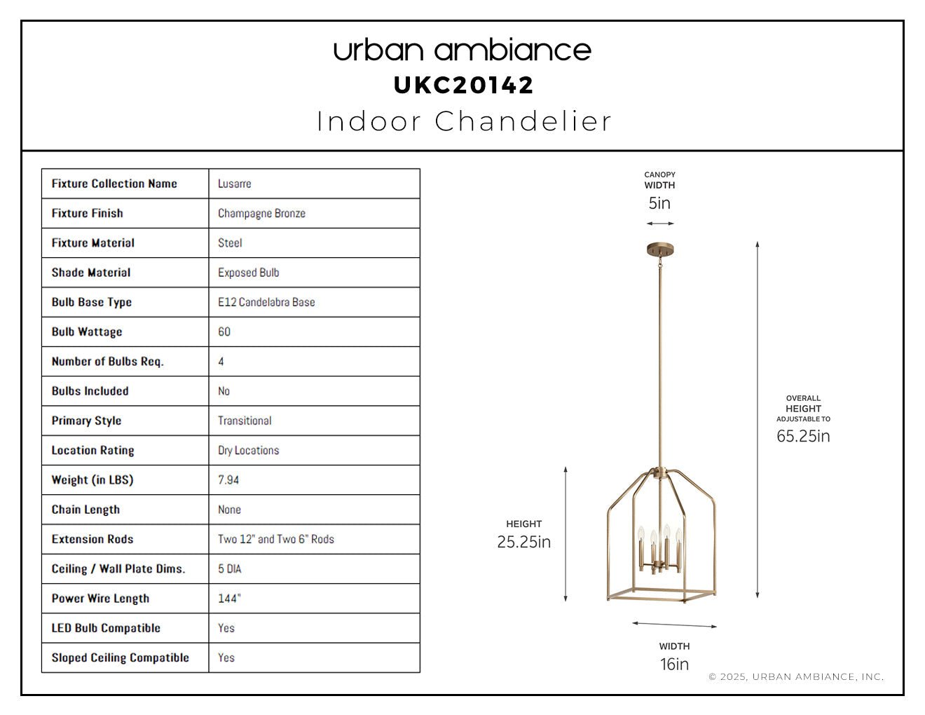 UKC20142 Transitional Indoor Chandelier, 25.25''H x 16''W x 16''Dep, Champagne Bronze Finish, Lusarre Collection