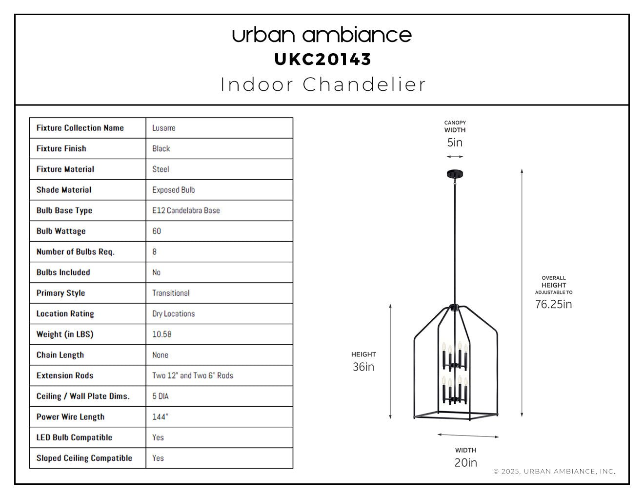 UKC20143 Transitional Indoor Chandelier, 36''H x 20''W x 20''Dep, Black Finish, Lusarre Collection