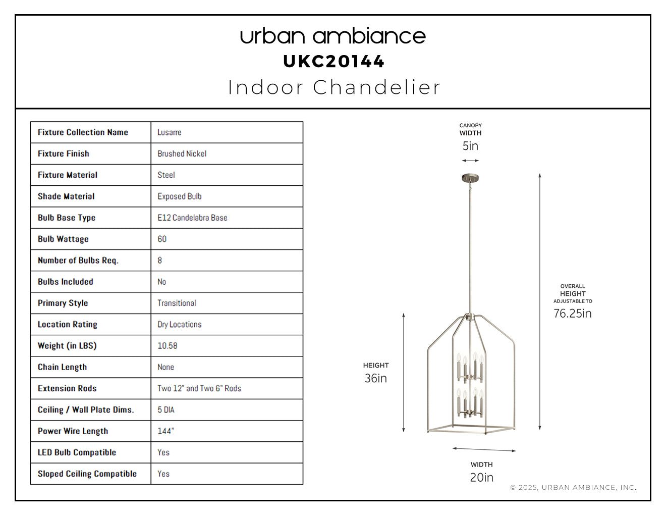 UKC20144 Transitional Indoor Chandelier, 36''H x 20''W x 20''Dep, Brushed Nickel Finish, Lusarre Collection