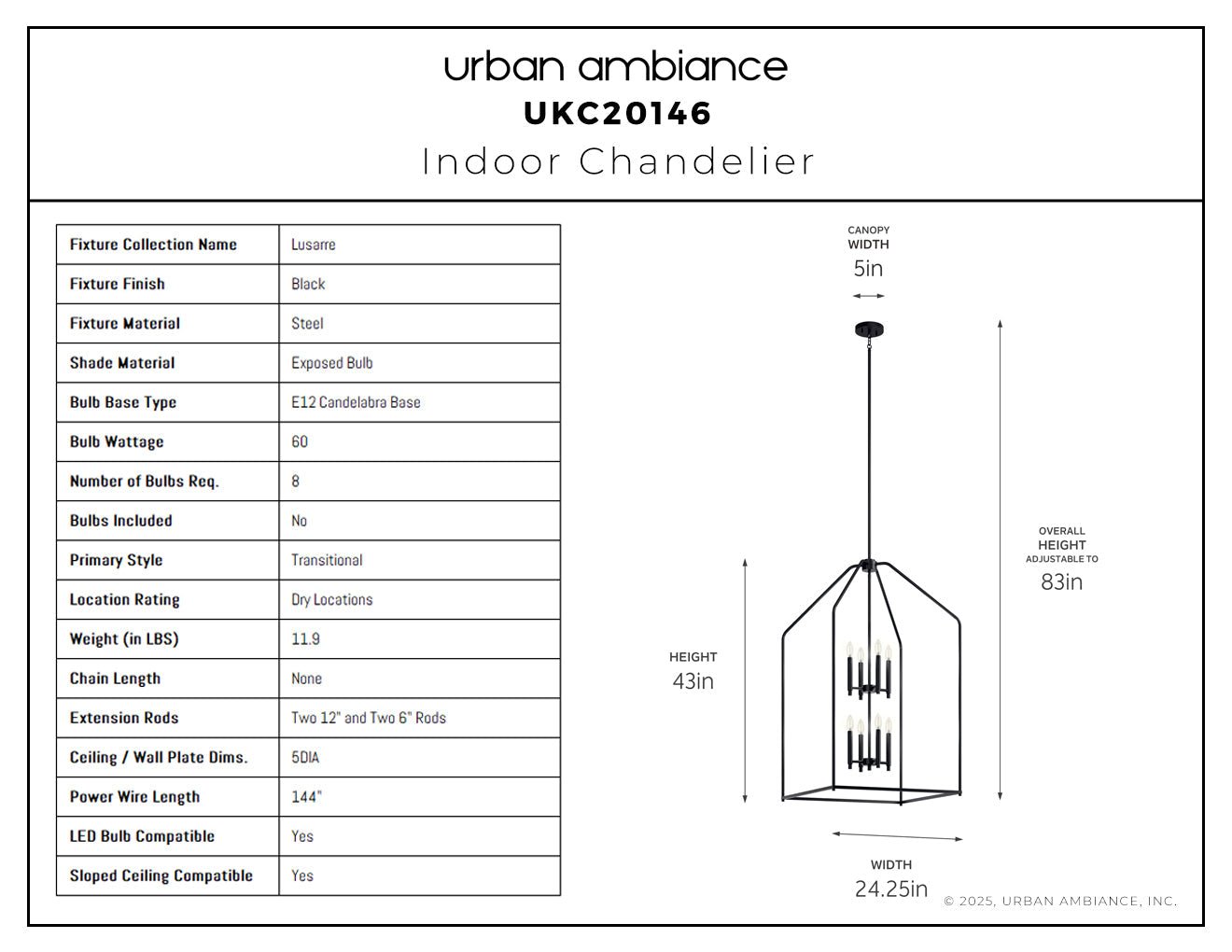 UKC20146 Transitional Indoor Chandelier, 43''H x 24.25''W x 24.25''Dep, Black Finish, Lusarre Collection