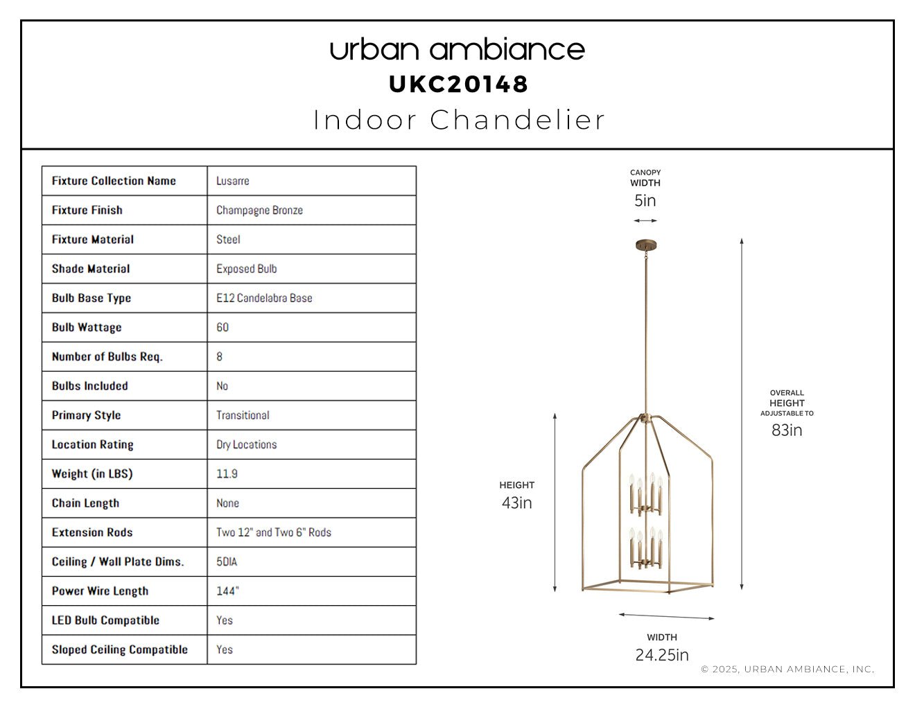 UKC20148 Transitional Indoor Chandelier, 43''H x 24.25''W x 24.25''Dep, Champagne Bronze Finish, Lusarre Collection