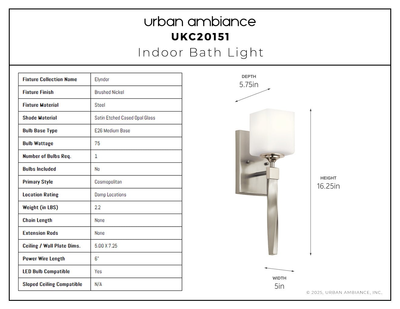 UKC20151 Cosmopolitan Indoor Bath Light, 16.25''H x 5''W x 5.75''Dep, Brushed Nickel Finish, Elyndor Collection