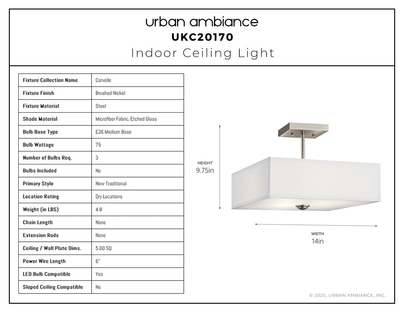 UKC20170 New Traditional Indoor Ceiling Light, 9.75''H x 14''W x 0''Dep, Brushed Nickel Finish, Corvelle Collection