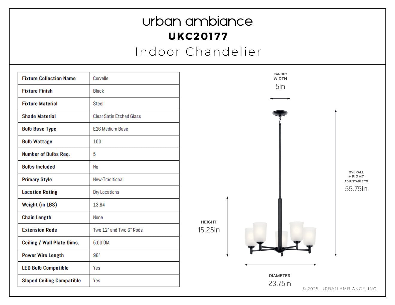 UKC20177 New Traditional Indoor Chandelier, 15.25''H x 23.75''W x 23.75''Dep, Black Finish, Corvelle Collection