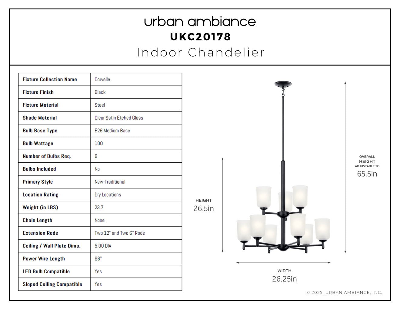 UKC20178 New Traditional Indoor Chandelier, 26.5''H x 26.5''W x 26.5''Dep, Black Finish, Corvelle Collection