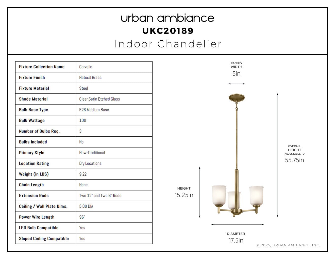 UKC20189 New Traditional Indoor Chandelier, 15.25''H x 17.5''W x 17.5''Dep, Natural Brass Finish, Corvelle Collection