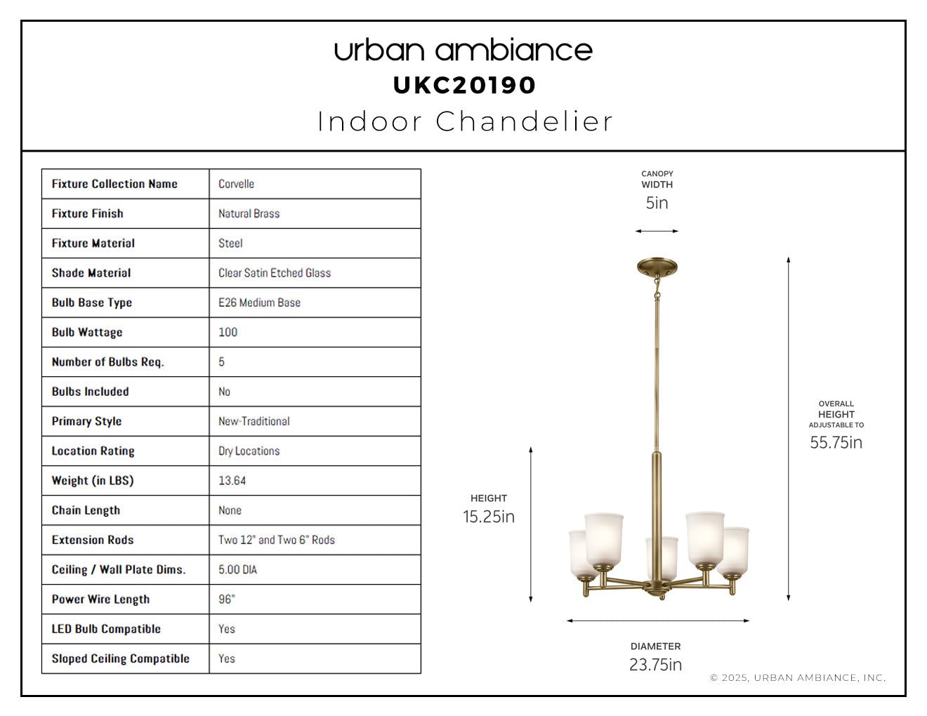 UKC20190 New Traditional Indoor Chandelier, 15.25''H x 23.75''W x 23.75''Dep, Natural Brass Finish, Corvelle Collection