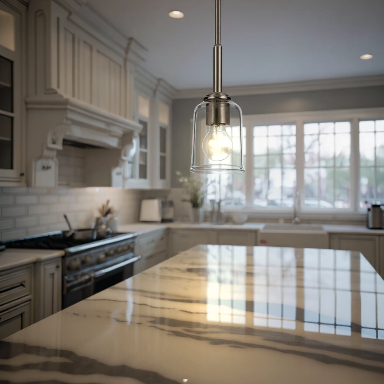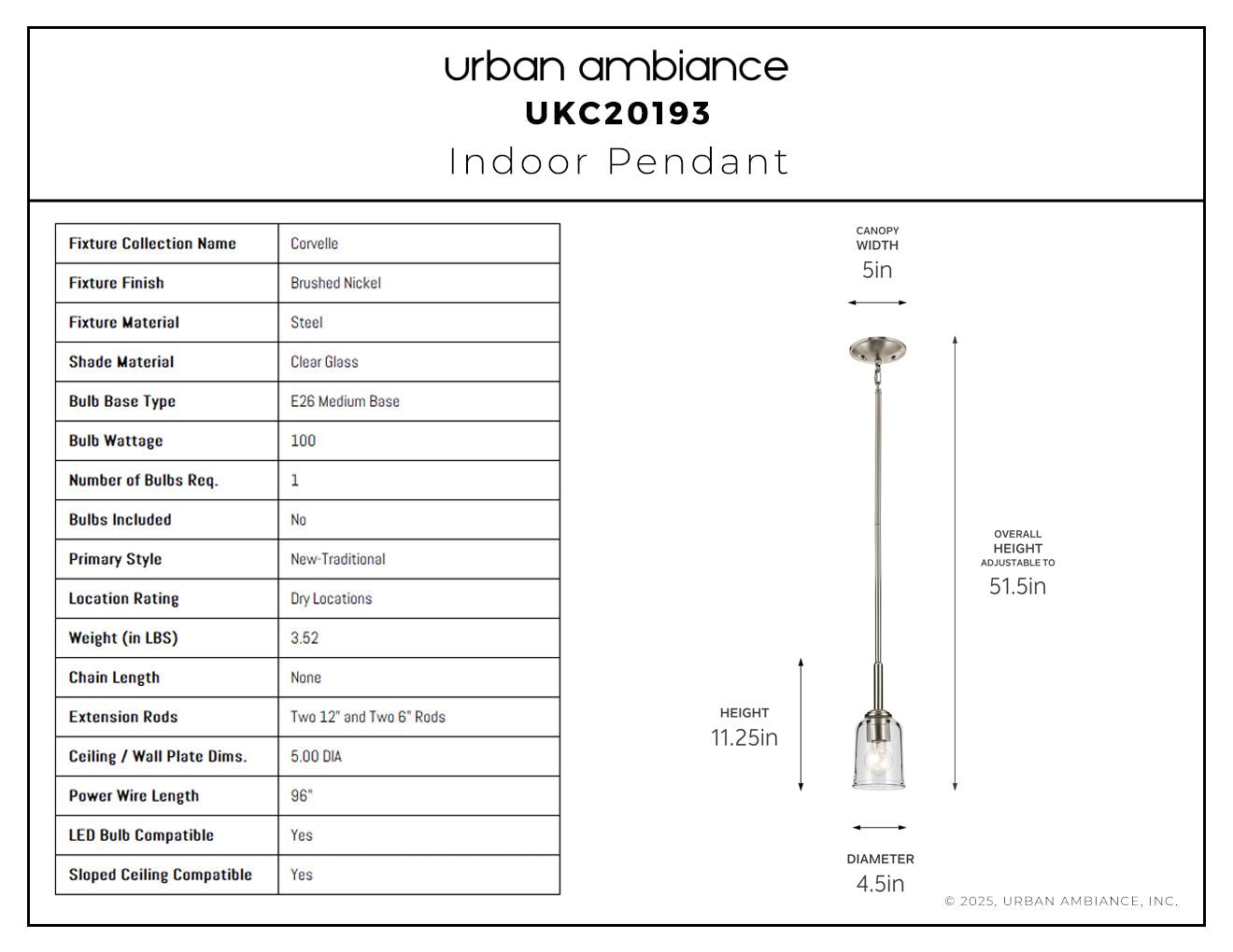 UKC20193 New Traditional Indoor Pendant, 11.25''H x 4.5''W x 4.5''Dep, Brushed Nickel Finish, Corvelle Collection