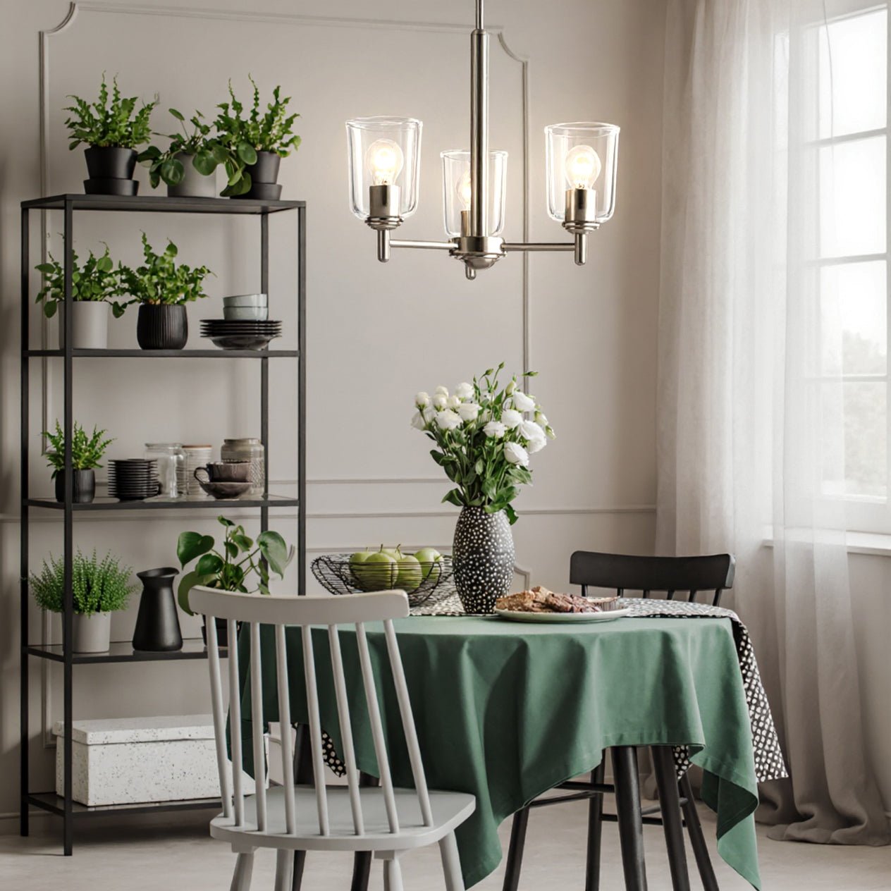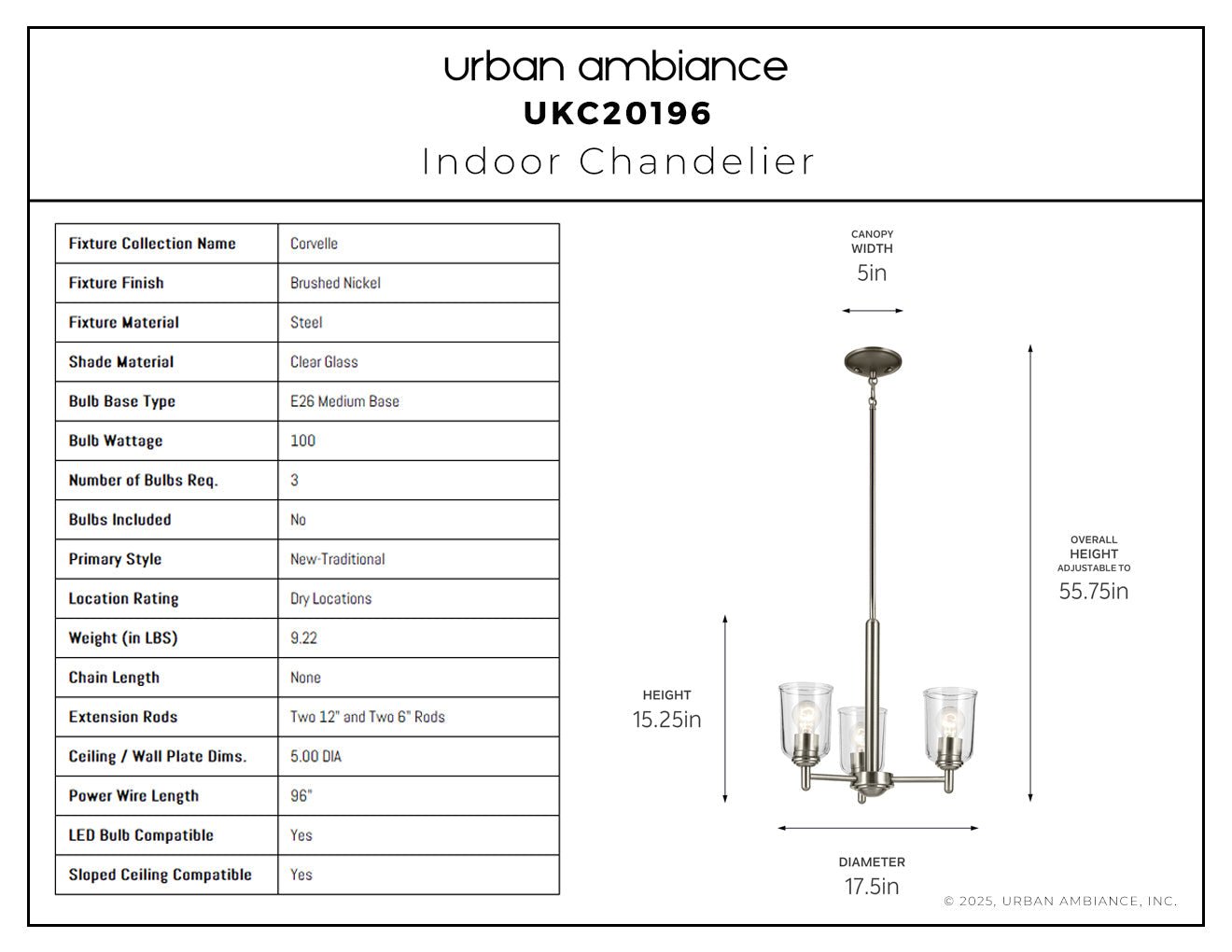UKC20196 New Traditional Indoor Chandelier, 15.25''H x 17.5''W x 17.5''Dep, Brushed Nickel Finish, Corvelle Collection