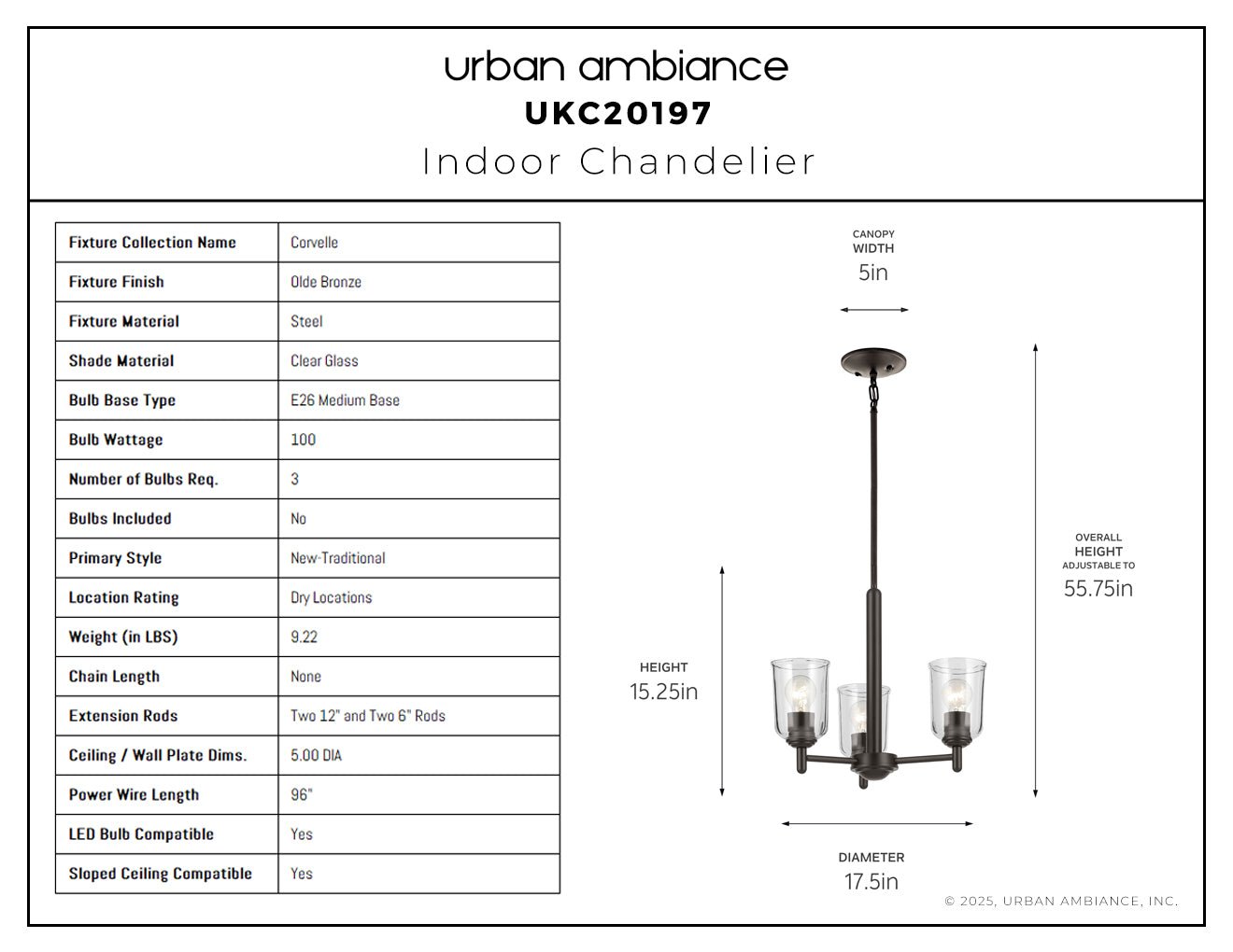 UKC20197 New Traditional Indoor Chandelier, 15.25''H x 17.5''W x 17.5''Dep, Olde Bronze Finish, Corvelle Collection