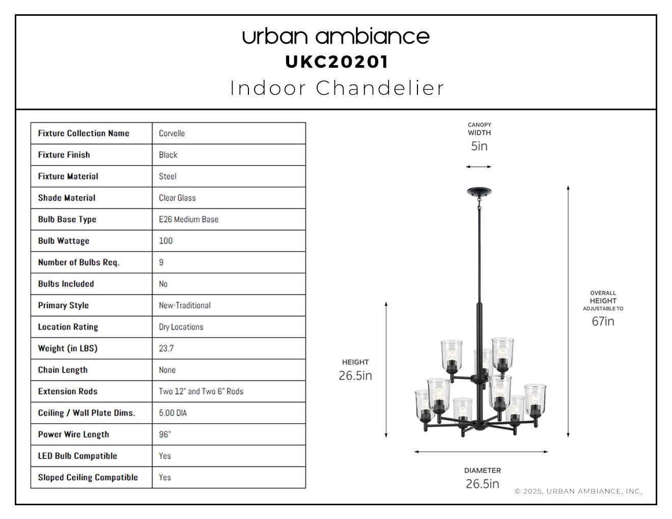 UKC20201 New Traditional Indoor Chandelier, 26.5''H x 26.5''W x 26.5''Dep, Black Finish, Corvelle Collection