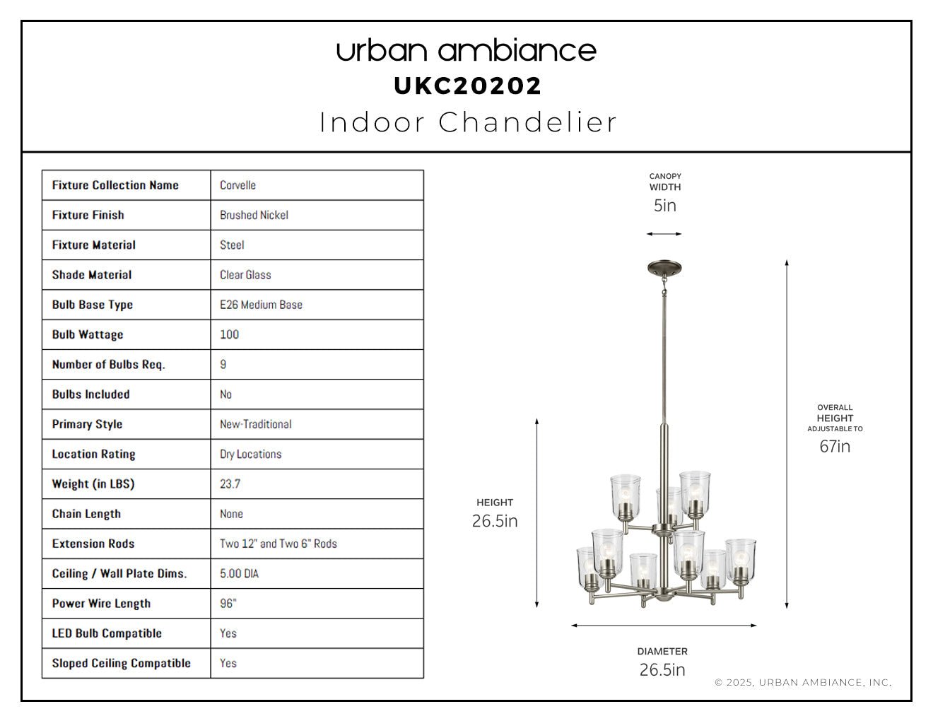 UKC20202 New Traditional Indoor Chandelier, 26.5''H x 26.5''W x 26.5''Dep, Brushed Nickel Finish, Corvelle Collection