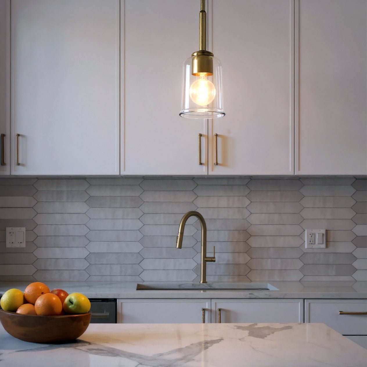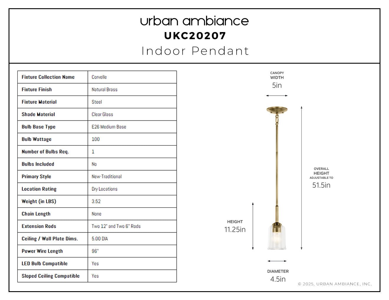 UKC20207 New Traditional Indoor Pendant, 11.25''H x 4.5''W x 4.5''Dep, Natural Brass Finish, Corvelle Collection