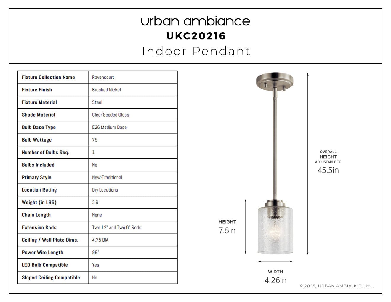 UKC20216 New Traditional Indoor Pendant, 7.5''H x 4.25''W x 4.25''Dep, Brushed Nickel Finish, Ravencourt Collection