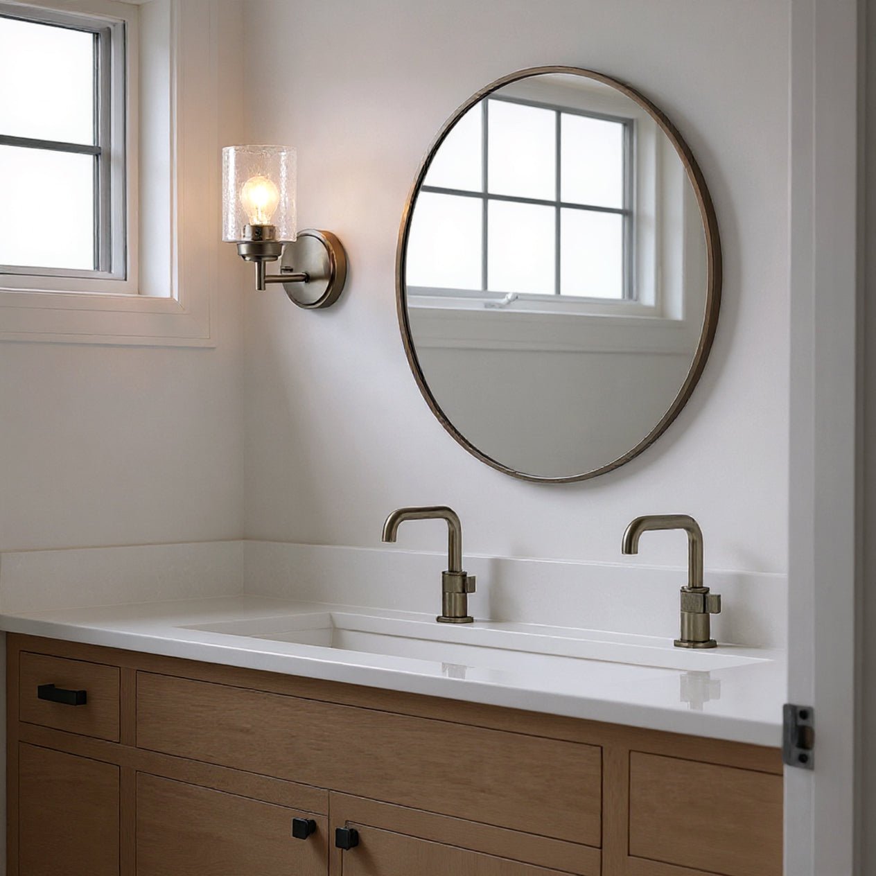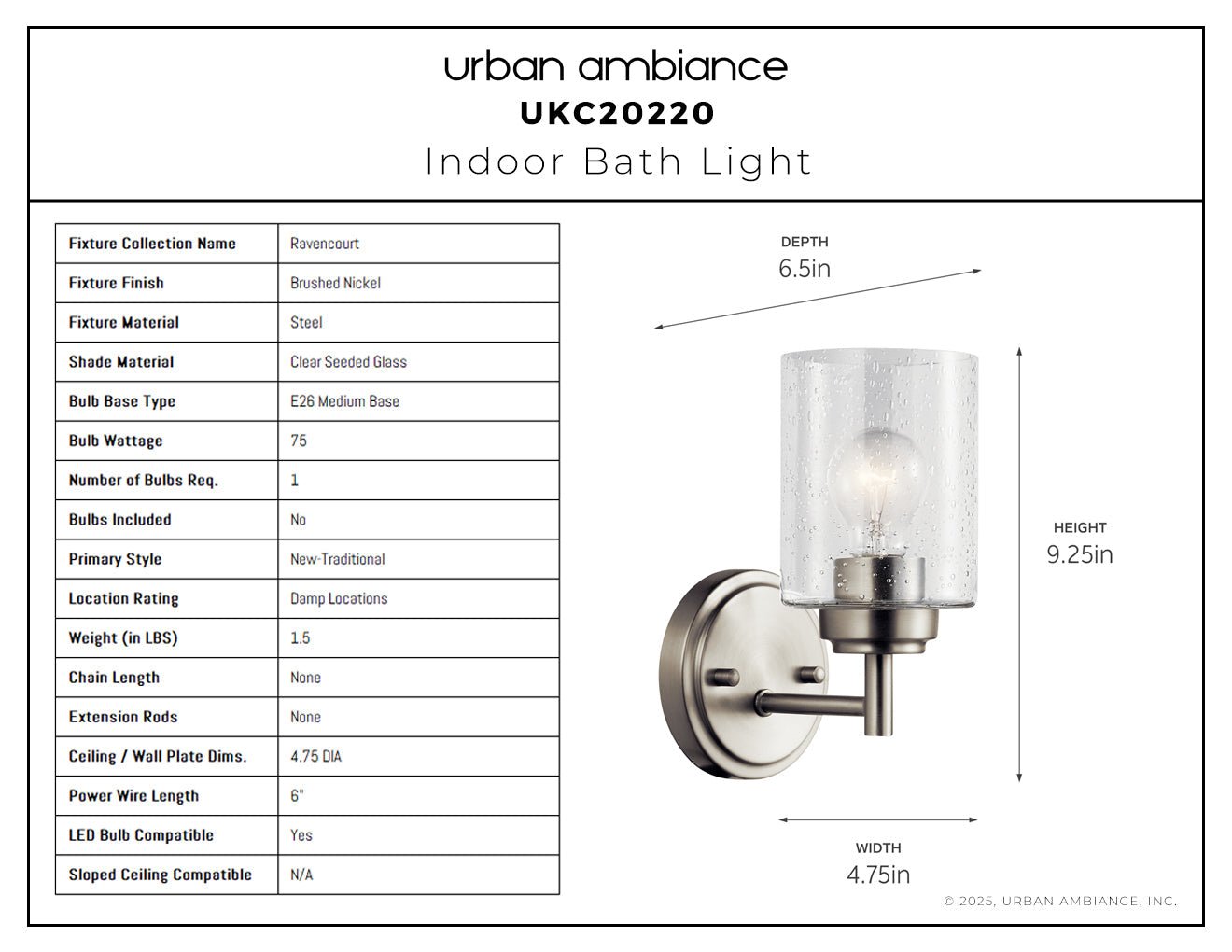 UKC20220 New Traditional Indoor Bath Light, 9.25''H x 4.75''W x 6.5''Dep, Brushed Nickel Finish, Ravencourt Collection