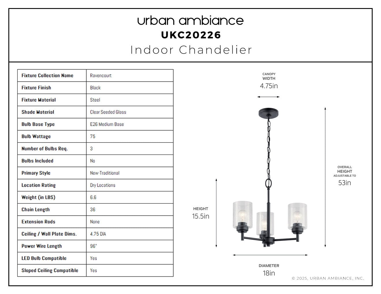 UKC20226 New Traditional Indoor Chandelier, 15.5''H x 18''W x 18''Dep, Black Finish, Ravencourt Collection