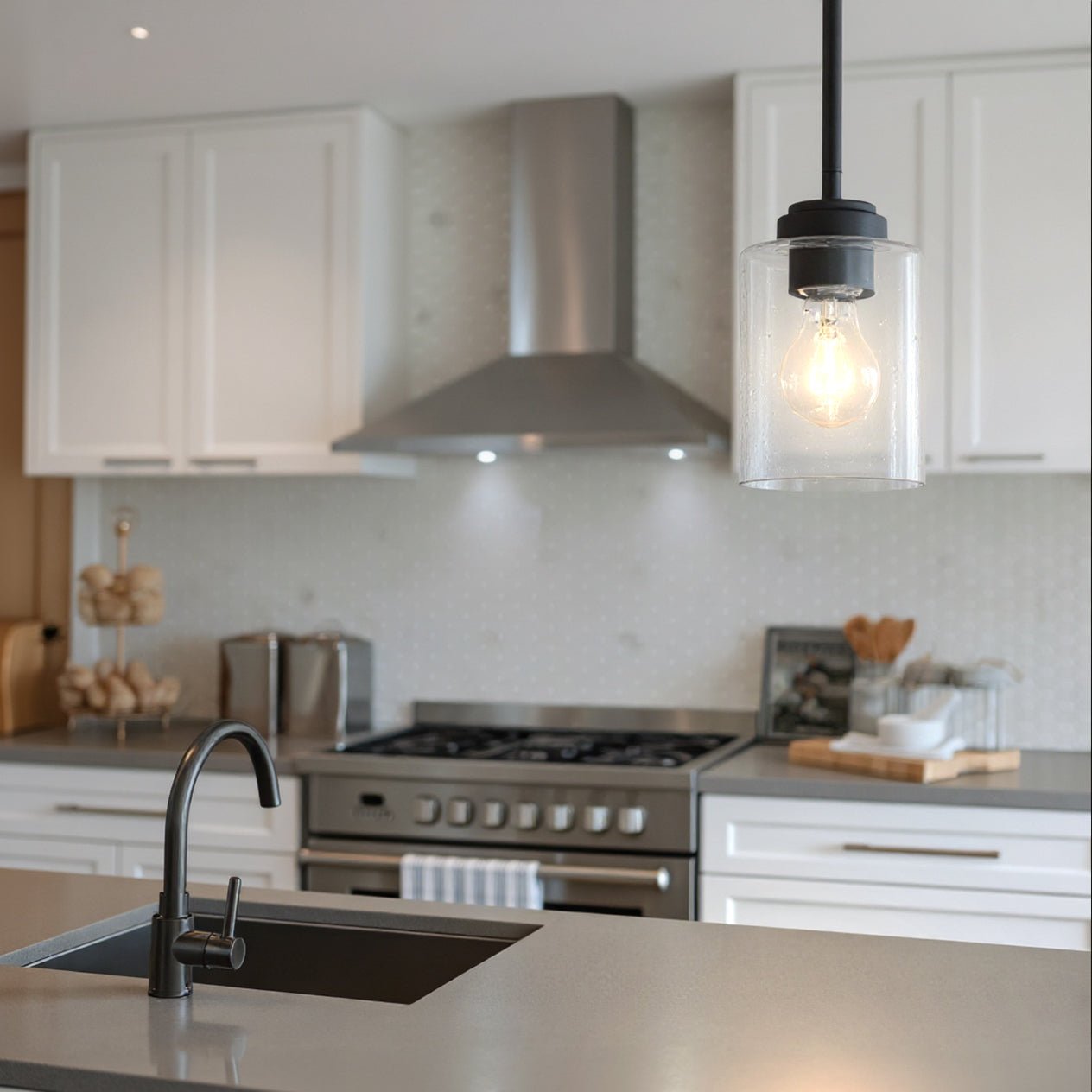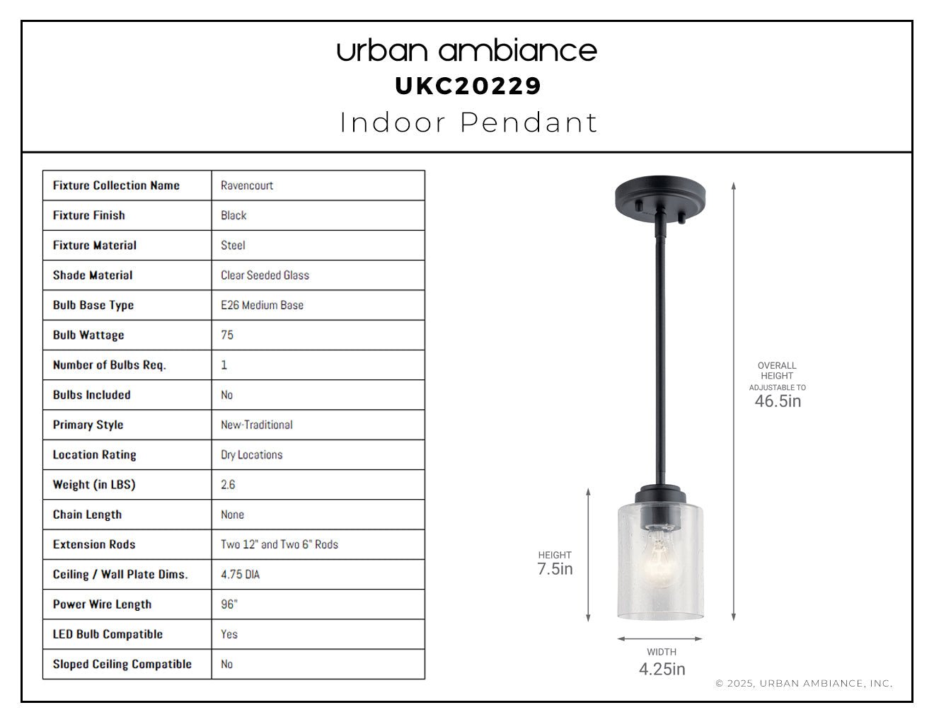 UKC20229 New Traditional Indoor Pendant, 7.5''H x 4.25''W x 4.25''Dep, Black Finish, Ravencourt Collection