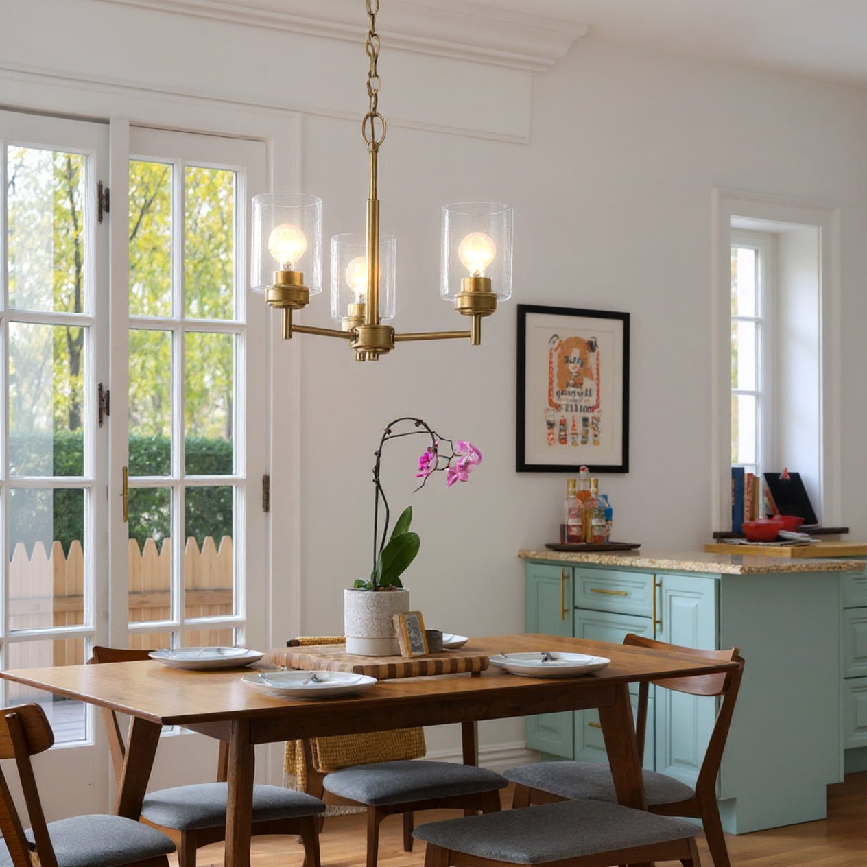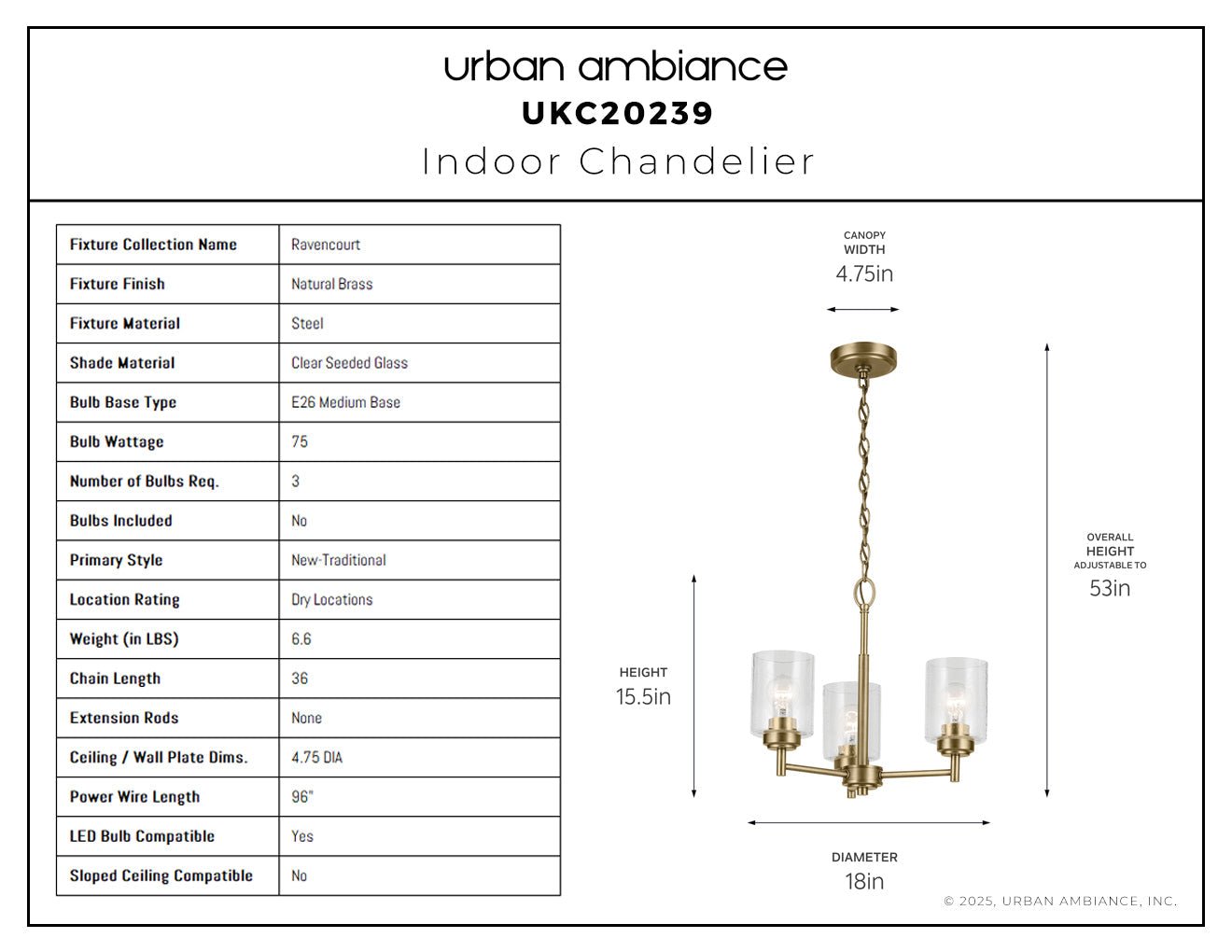 UKC20239 New Traditional Indoor Chandelier, 15.5''H x 18''W x 18''Dep, Natural Brass Finish, Ravencourt Collection
