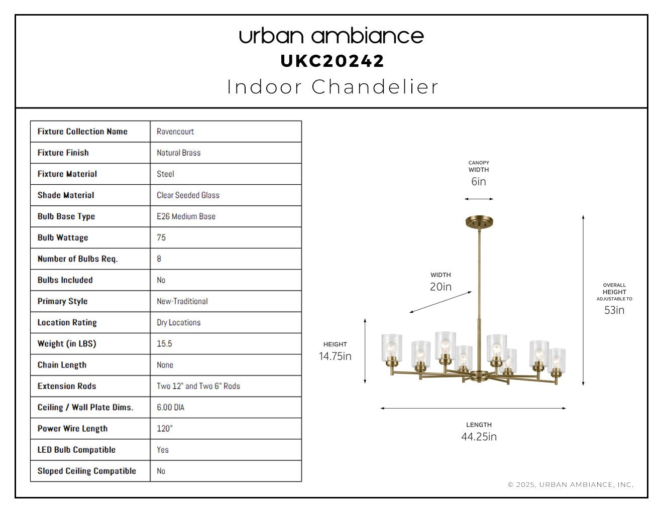 UKC20242 New Traditional Indoor Chandelier, 14.75''H x 44.5''W x 20''Dep, Natural Brass Finish, Ravencourt Collection