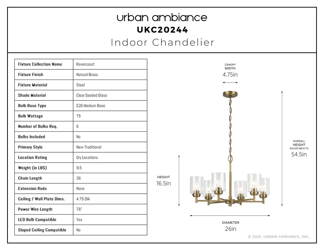 UKC20244 New Traditional Indoor Chandelier, 16.5''H x 26''W x 26''Dep, Natural Brass Finish, Ravencourt Collection