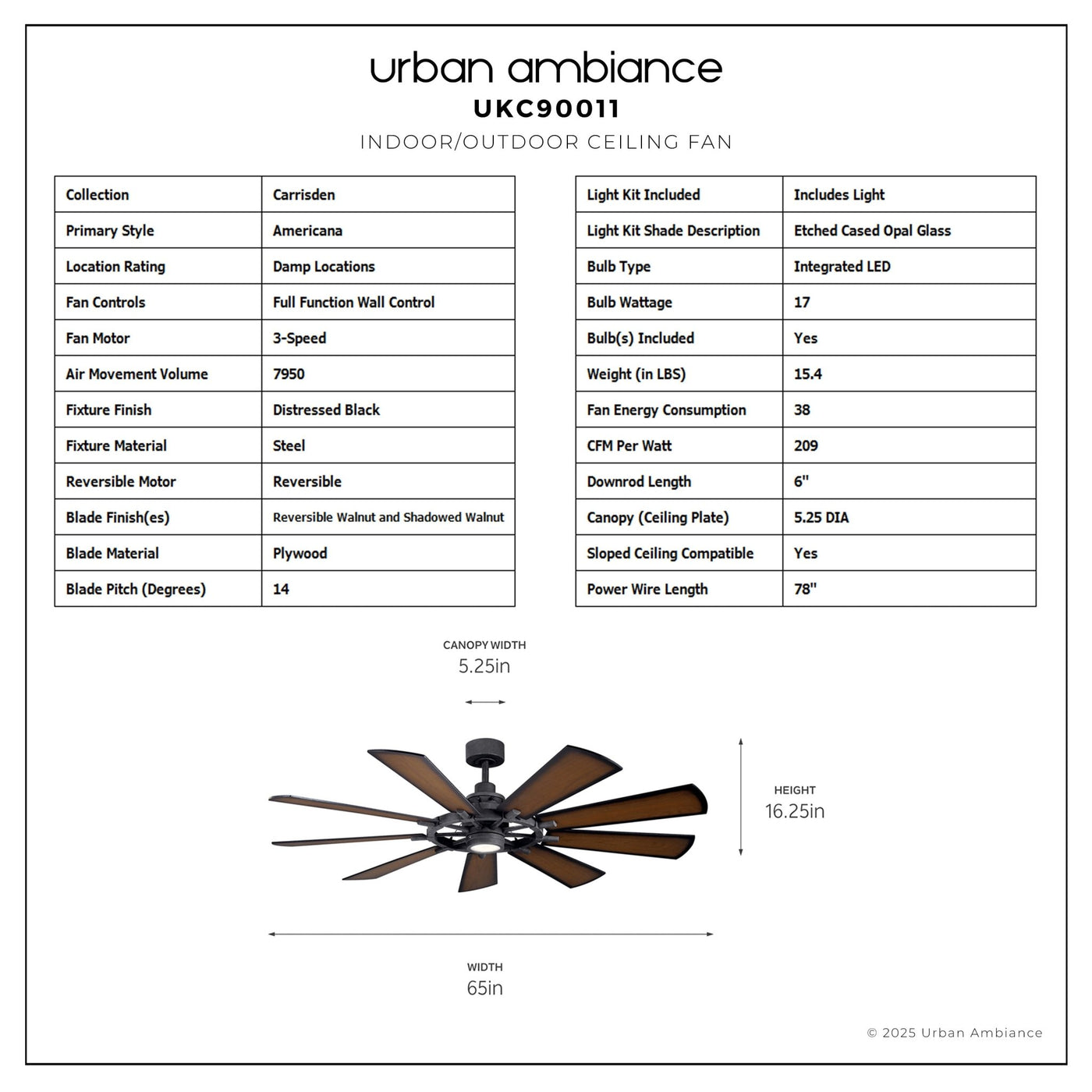 UKC90011 Americana Indoor / Outdoor Ceiling Fan, 16.75''H x 65''W x 65''Dep, Distressed Black Finish, Carrisden Collection