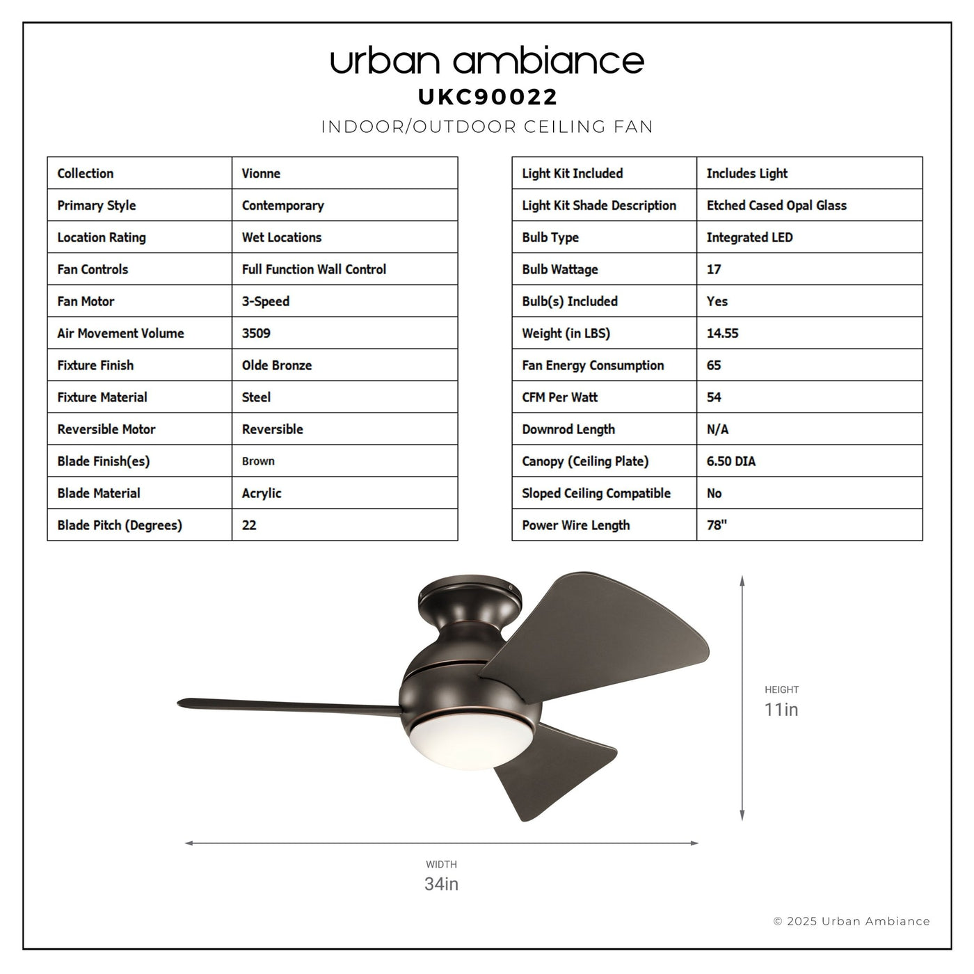 UKC90022 Contemporary Indoor / Outdoor Ceiling Fan, 11''H x 34''W x 34''Dep, Olde Bronze Finish, Vionne Collection