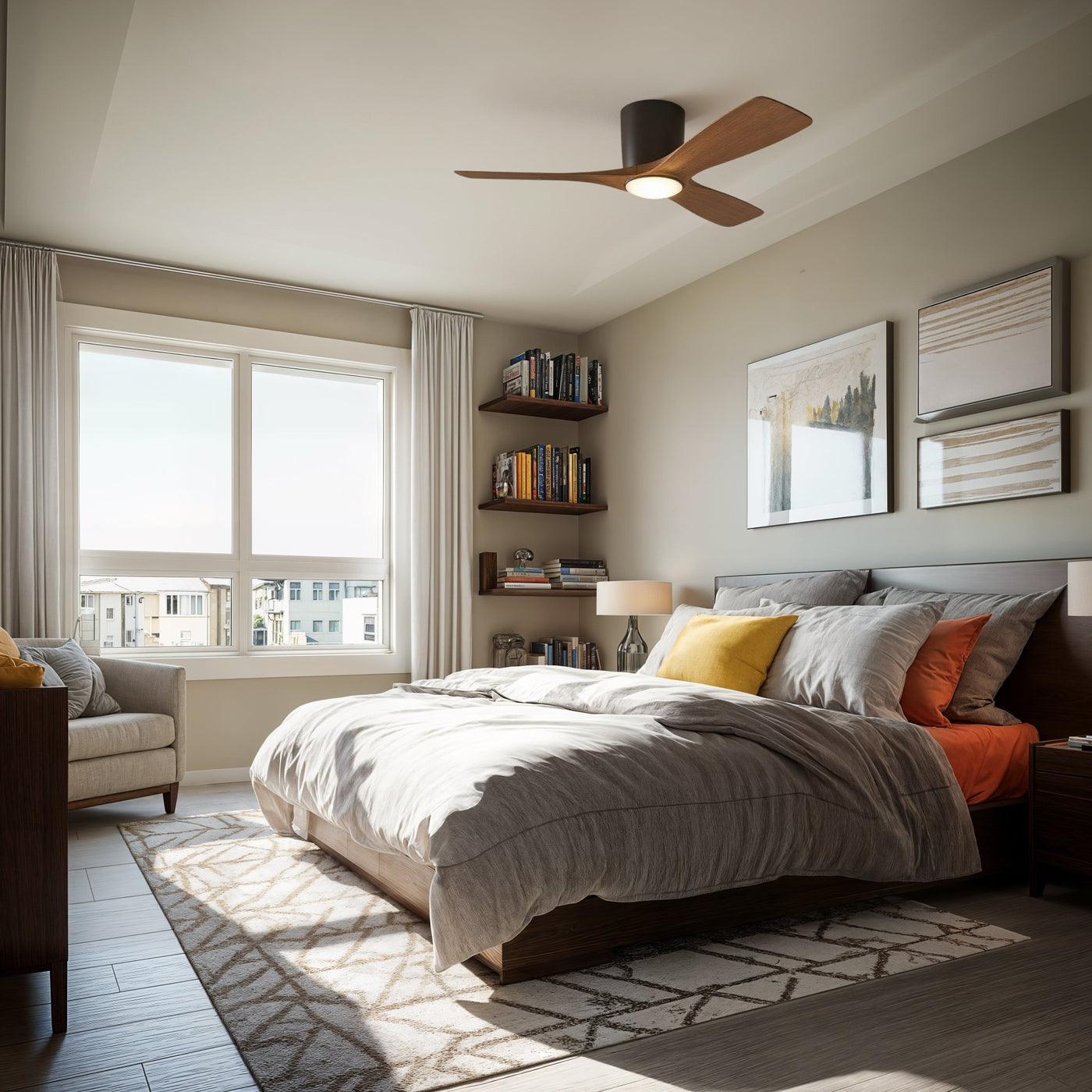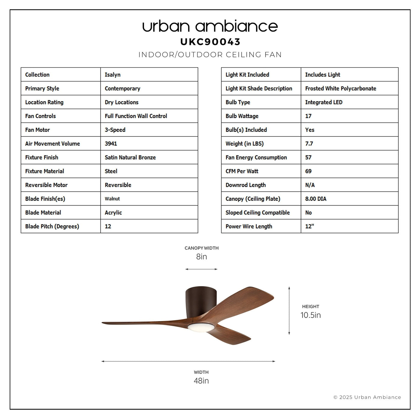 UKC90043 Contemporary Indoor Ceiling Fan, 10.5''H x 48''W x 48''Dep, Satin Natural Bronze Finish, Isalyn Collection