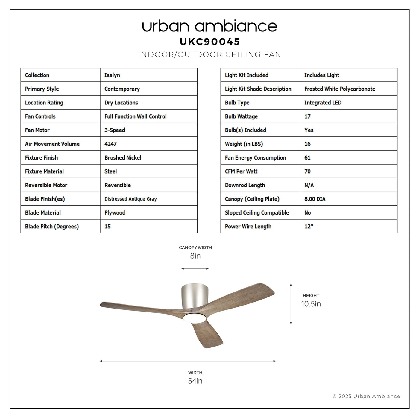UKC90045 Contemporary Indoor Ceiling Fan, 10.5''H x 54''W x 54''Dep, Brushed Nickel Finish, Isalyn Collection