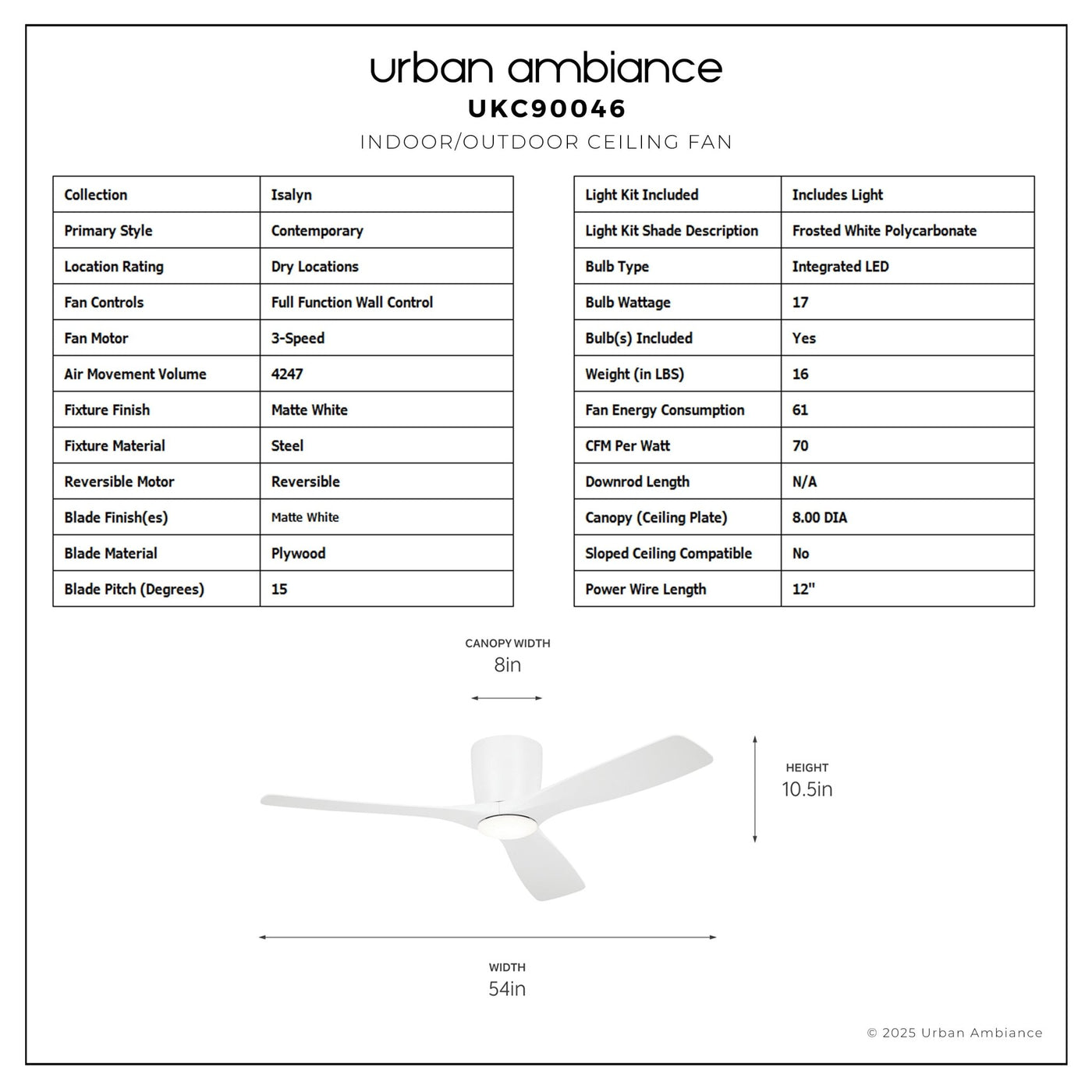 UKC90046 Contemporary Indoor Ceiling Fan, 10.5''H x 54''W x 54''Dep, Matte White Finish, Isalyn Collection