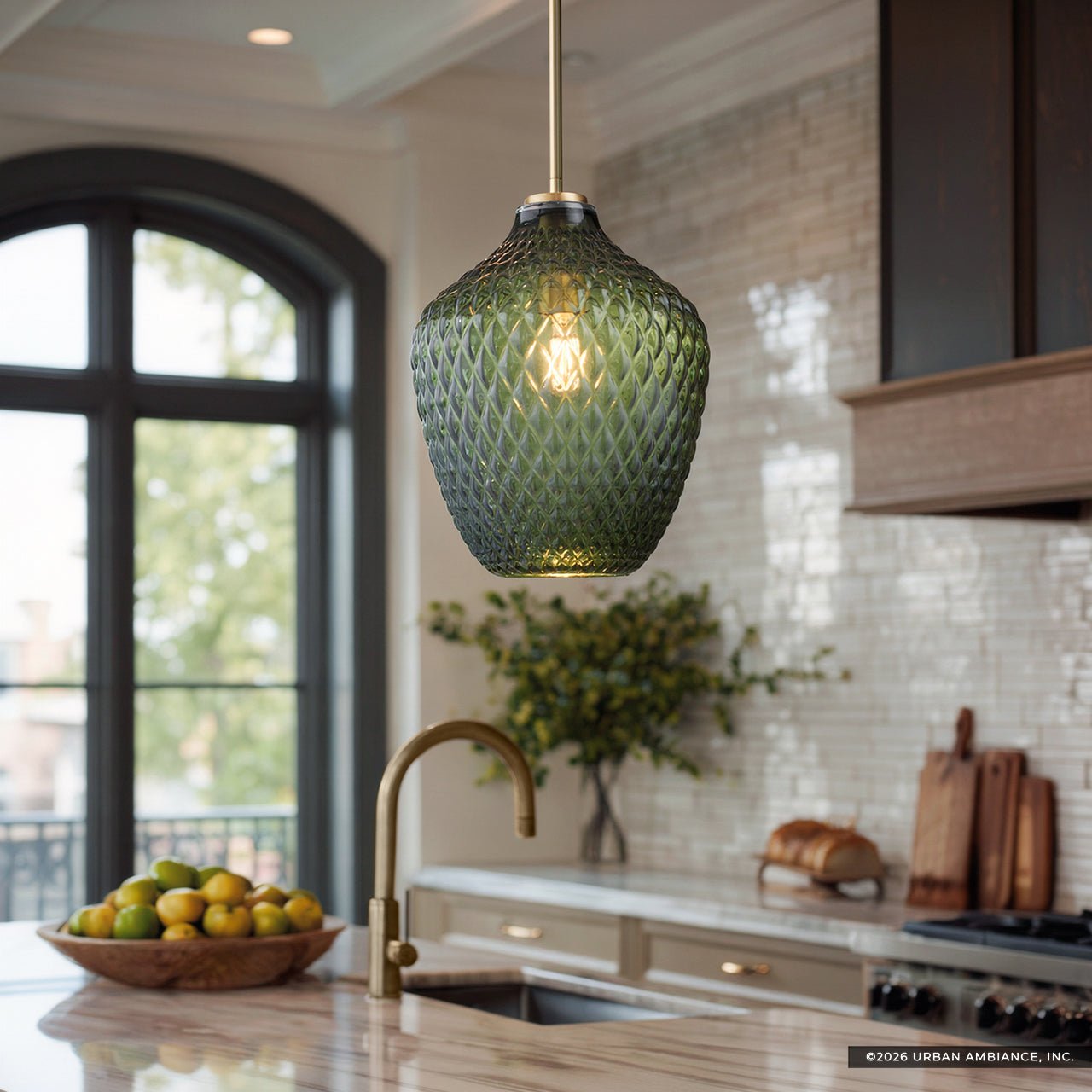 ULB2240 Mid-Century Modern Pendant , 13''H x 11''W, Brushed Brass and Stained Glass Finish, Cardiff Collection